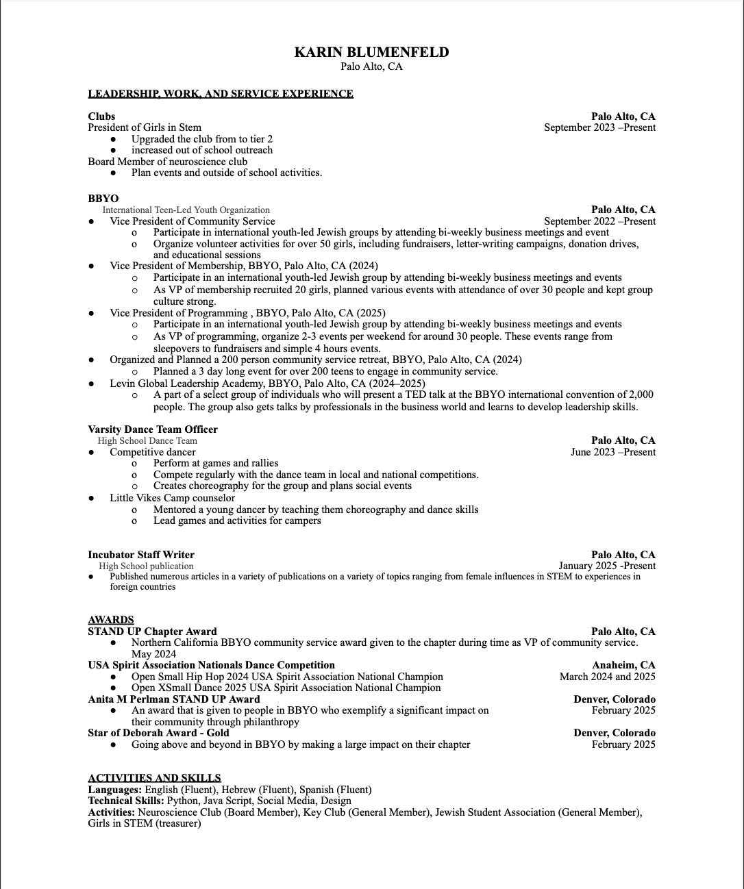 My name is Karin Blumenfeld and I am a student in the class of 2027 at Palo Alto High School. I am a student journalist, dancer, and leader in BBYO.